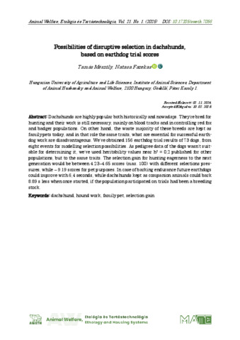 Mészöly, Tamás és Fazekas, Natasa (2025) Possibilities of disruptive selection in dachshunds, based on earthdog trial scores. ANIMAL WELFARE ETOLÓGIA ÉS TARTÁSTECHNOLÓGIA / ANIMAL WELFARE ETHOLOGY AND HOUSING SYSTEMS, 21 (1). pp. 61-66. ISSN 1786-8440