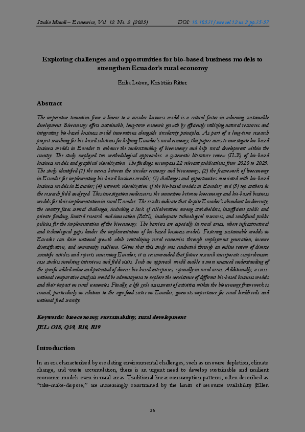 Luzon Tandazo, Erika Yessenia és Ritter, Krisztián (2025) Exploring Challenges and Opportunities for Bio-based Business Models to Strengthen Ecuador's Rural Economy. STUDIA MUNDI - ECONOMICA, 12 (2). pp. 35-57. ISSN 2415-9395