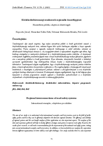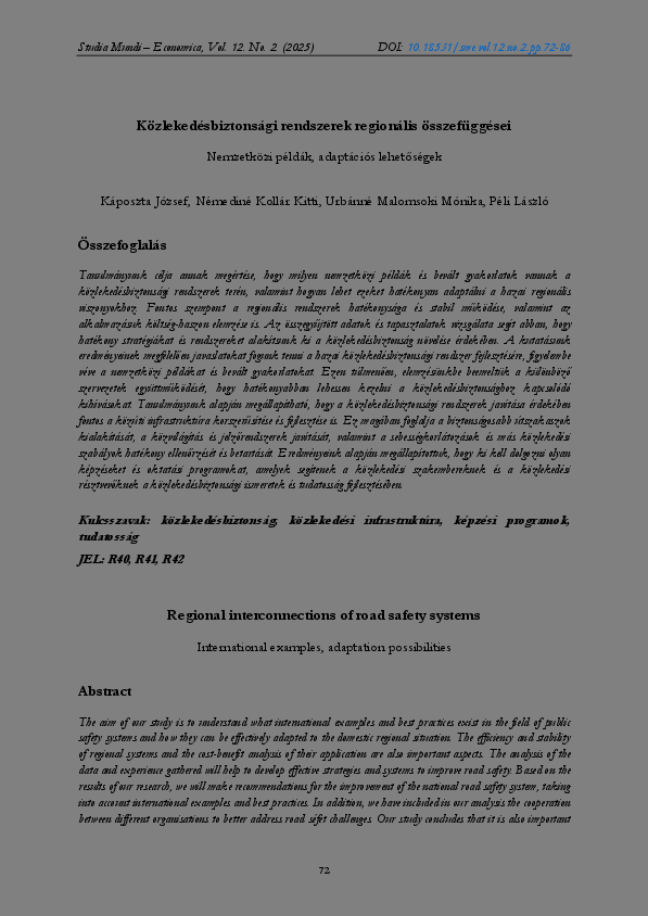Káposzta, József és Némediné Kollár, Kitti és Urbánné Malomsoki, Mónika és Péli, László (2025) Közlekedésbiztonsági rendszerek regionális összefüggései : Nemzetközi példák, adaptációs lehetőségek. STUDIA MUNDI - ECONOMICA, 12 (2). pp. 72-86. ISSN 2415-9395