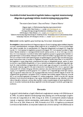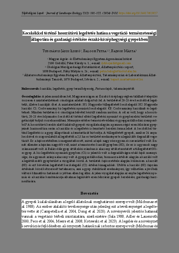 Járdi, Ildikó és Balogh, Petra és Bajnok, Márta (2024) Kecskékkel történő hosszútávú legeltetés hatása a vegetáció természetességi állapotára és gazdasági értékére északi-középhegységi gyepekben. TÁJÖKOLÓGIAI LAPOK / JOURNAL OF LANDSCAPE ECOLOGY, 22 (2). pp. 101-122. ISSN 1589-4673