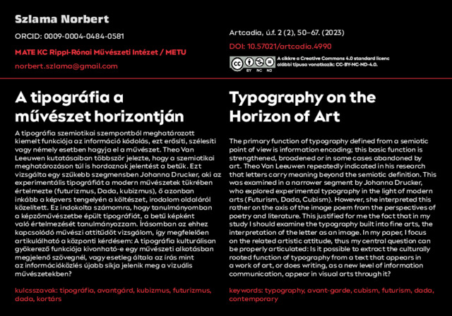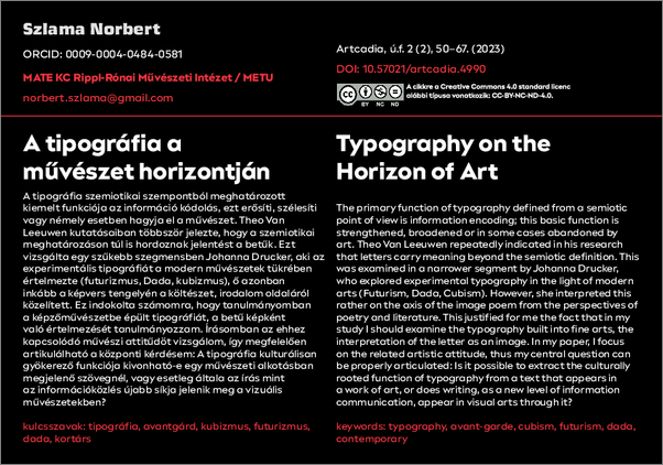 Szlama, Norbert (2023) A tipográfia a művészet horizontján. ARTCADIA: A KAPOSVÁRI EGYETEM MŰVÉSZETI FŐISKOLAI KAR MŰVÉSZETI ÉS TUDOMÁNYOS KÖZLEMÉNYEI, úf. 2 (2). pp. 50-67. ISSN 2060-3266