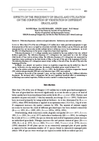 Bajnok, Márta és Buchgraber, K és Szentes, Szilárd és Tasi, Juliánna Eszter (2009) Effects of the frequency of grassland utilisation on the composition of vegetation in different grasslands. TÁJÖKOLÓGIAI LAPOK / JOURNAL OF LANDSCAPE ECOLOGY, 7 (2). pp. 403-408. ISSN 1589-4673
