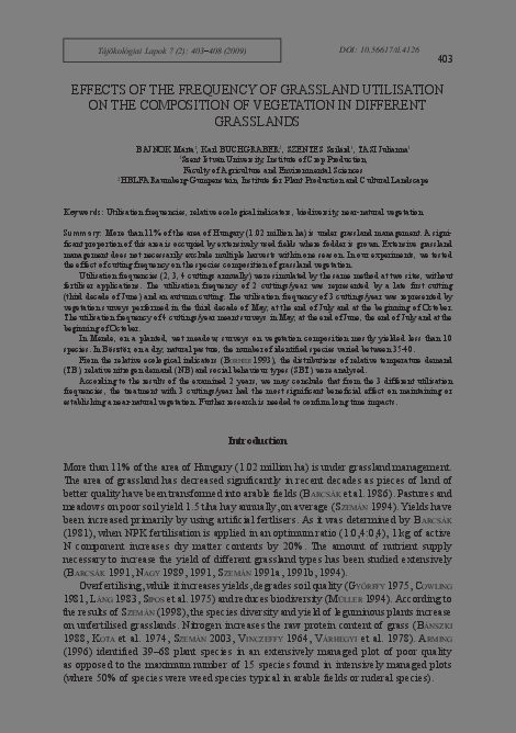 | Kivonat, rövid leírás: | More than 11% of the area of Hungary (1.02 million ha) is under grassland management. A significant proportion of this area is occupied by extensively used fields where fodder is grown. Extensive grassland management does not necessarily exclude multiple harvests within one season. In our experiments, we tested the effect of cutting frequency on the species composition of grassland vegetation. |