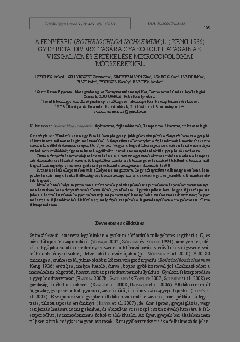 Szentes, Szilárd és Szentesné Sutyinszki, Zsuzsanna és Zimmermann, Zita és Szabó, Gábor és Járdi, Ildikó és Házi, Judit és Penksza, Károly és Bartha, Sándor (2011) A fenyérfű (Bothriochloa ischaemum (L.) Keng 1936) gyep béta-diverzitására gyakorolt hatásainak vizsgálata és értékelése mikrocönológiai módszerekkel. TÁJÖKOLÓGIAI LAPOK / JOURNAL OF LANDSCAPE ECOLOGY, 9 (2). pp. 469-481. ISSN 1589-4673