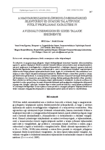 Pető, Ákos és Barczi, Attila (2011) A Magyarországon előforduló meghatározó jelentőségű és gyakori talajtípusok fitolit profiljának katasztere IV. A vizsgált csernozjom és szikes talajok eredményei. TÁJÖKOLÓGIAI LAPOK / JOURNAL OF LANDSCAPE ECOLOGY, 9 (1). pp. 147-190. ISSN 1589-4673