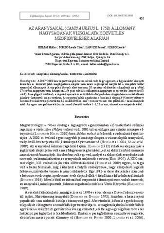 Heltai, Miklós és Torbó, László Tibor és Lanszki, József és Szabó, László (2012) Az aranysakál (Canis aureus L. 1758) állomány nagyságának vizsgálata közvetlen megfigyelések alapján. TÁJÖKOLÓGIAI LAPOK / JOURNAL OF LANDSCAPE ECOLOGY, 10 (2). pp. 405-411. ISSN 1589-4673