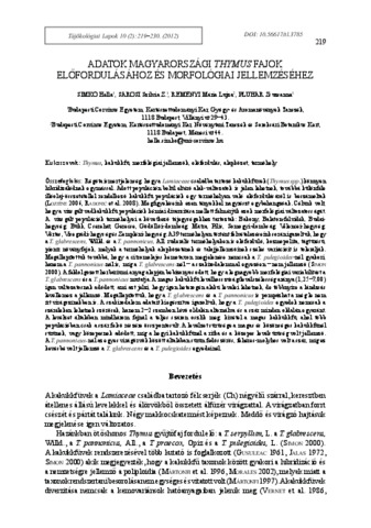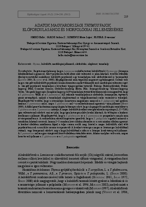 Simkó, Hella és Tavaszi-Sárosi, Szilvia és Reményi, M L és Pluhár, Zsuzsanna (2012) Adatok magyarországi Thymus fajok előfordulásához és morfológiai jellemzéséhez. TÁJÖKOLÓGIAI LAPOK / JOURNAL OF LANDSCAPE ECOLOGY, 10 (2). pp. 219-230. ISSN 1589-4673