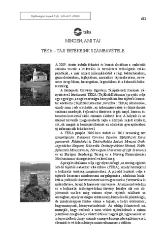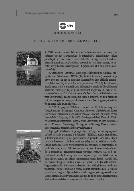 Kollányi, László (2010) Minden, ami táj. TÉKA - Táji értékeink számbavétele. TÁJÖKOLÓGIAI LAPOK / JOURNAL OF LANDSCAPE ECOLOGY, 8 (3). pp. 633-635. ISSN 1589-4673