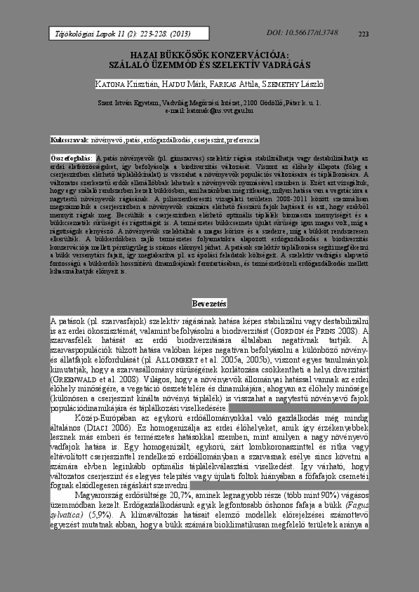 Katona, Krisztián és Hajdu, Márk és Farkas, Attila és Szemethy, László (2013) Hazai bükkösök konzervációja: szálaló üzemmód és szelektív vadrágás. TÁJÖKOLÓGIAI LAPOK / JOURNAL OF LANDSCAPE ECOLOGY, 11 (2). pp. 223-228. ISSN 1589-4673