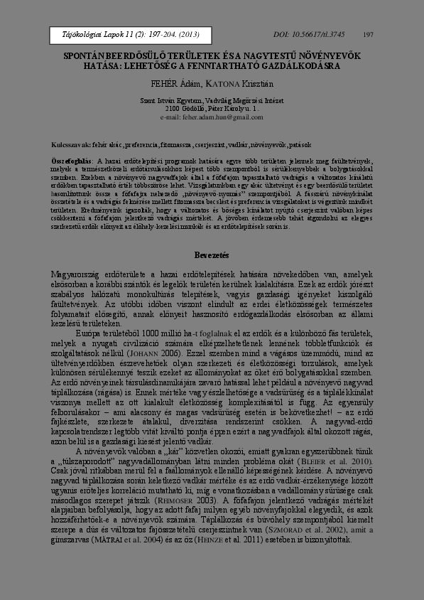 Fehér, Ádám és Katona, Krisztián (2013) Spontán beerdősülő területek és a nagytestű növényevők hatása: lehetőség a fenntartható gazdálkodásra. TÁJÖKOLÓGIAI LAPOK / JOURNAL OF LANDSCAPE ECOLOGY, 11 (2). pp. 197-204. ISSN 1589-4673