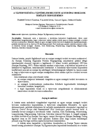 Filepné Kovács, Krisztina és Valánszki, István és Sallay, Ágnes és Jombach, Sándor (2013) A tájtervezés és a tájvédelem helyzete az európai országok területi tervezésében. TÁJÖKOLÓGIAI LAPOK / JOURNAL OF LANDSCAPE ECOLOGY, 11 (2). pp. 279-290. ISSN 1589-4673