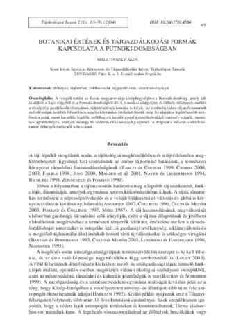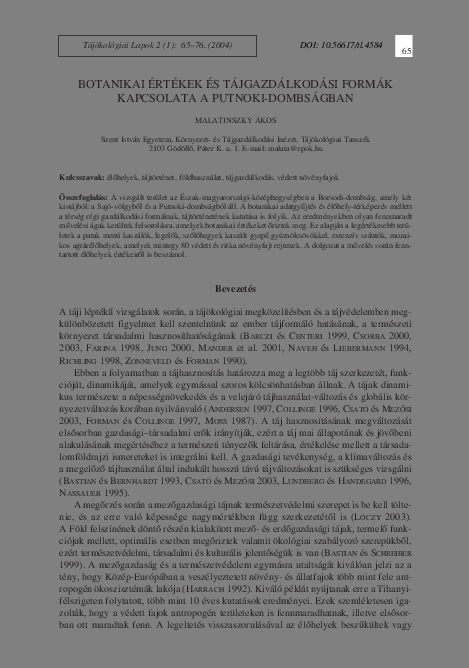Malatinszky, Ákos (2004) Botanikai értékek és tájgazdálkodási formák kapcsolata a Putnoki-dombságban. TÁJÖKOLÓGIAI LAPOK / JOURNAL OF LANDSCAPE ECOLOGY, 2 (1). pp. 65-76. ISSN 1589-4673