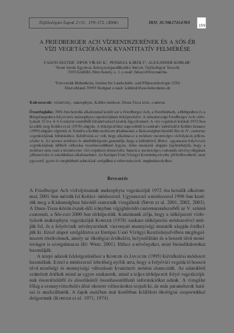 Falusi, Eszter és Sipos, V K és Penksza, Károly és Kohler, A (2004) A Friedberger Ach vízrendszerének és a Sós-ér vízi vegetációjának kvantitatív felmérése. TÁJÖKOLÓGIAI LAPOK / JOURNAL OF LANDSCAPE ECOLOGY, 2 (1). pp. 159-172. ISSN 1589-4673
