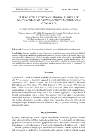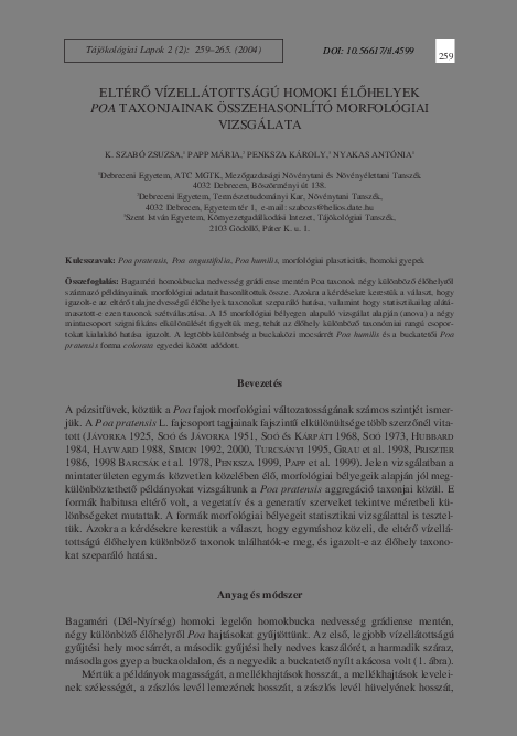 Lisztes-Szabó, Zsuzsa és Papp, M és Penksza, Károly és Nyakas, A (2004) Eltérő vízellátottságú homoki élőhelyek Poa taxonjainak összehasonlító morfológiai vizsgálata. TÁJÖKOLÓGIAI LAPOK / JOURNAL OF LANDSCAPE ECOLOGY, 2 (2). pp. 259-265. ISSN 1589-4673