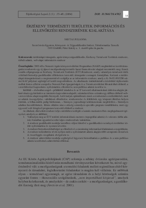 Skutai, Julianna (2004) Érzékeny Természeti Területek információs és ellenőrzési rendszerének kialakítása. TÁJÖKOLÓGIAI LAPOK / JOURNAL OF LANDSCAPE ECOLOGY, 2 (1). pp. 35-48. ISSN 1589-4673