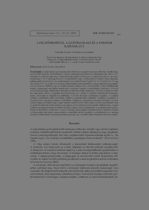Centeri, Csaba és Császár, A (2005) A felszínborítás, a lejtőszakasz és a foszfor kapcsolata. TÁJÖKOLÓGIAI LAPOK / JOURNAL OF LANDSCAPE ECOLOGY, 3 (1). pp. 119-131. ISSN 1589-4673