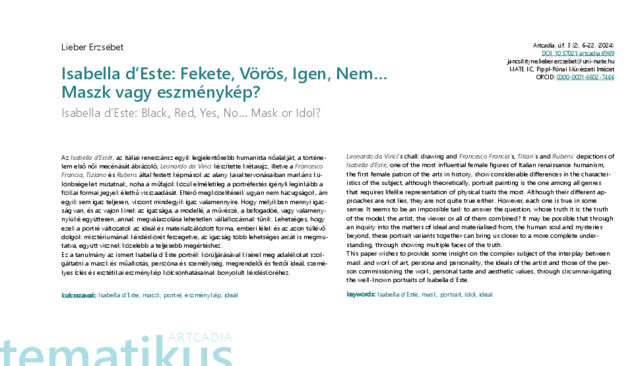 Jancsikityné Lieber, Erzsébet (2024) Isabella d’Este: Fekete, Vörös, Igen, Nem… Maszk vagy eszménykép? ARTCADIA: A KAPOSVÁRI EGYETEM MŰVÉSZETI FŐISKOLAI KAR MŰVÉSZETI ÉS TUDOMÁNYOS KÖZLEMÉNYEI, úf. 3 (2). pp. 6-22. ISSN 2060-3266