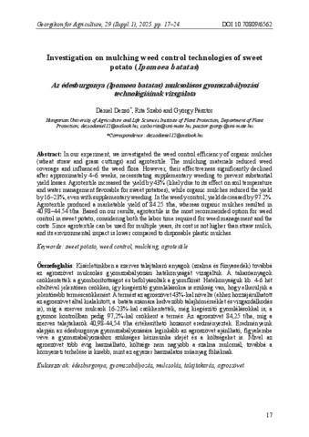 Dezső, Dániel és Szabó, Rita és Pásztor, György (2025) Investigation on mulching weed control technologies of sweet potato (Ipomoea batatas). GEORGIKON FOR AGRICULTURE: A MULTIDISCIPLINARY JOURNAL IN AGRICULTURAL SCIENCES, 29 (Suppl1). pp. 17-24. ISSN 0239-1260