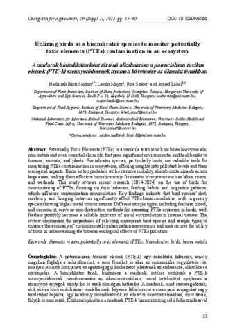 Kulcsszavak: Heavy metals; BIRDS; Potentially toxic elements (PTEs); thematic review; bioindicator;