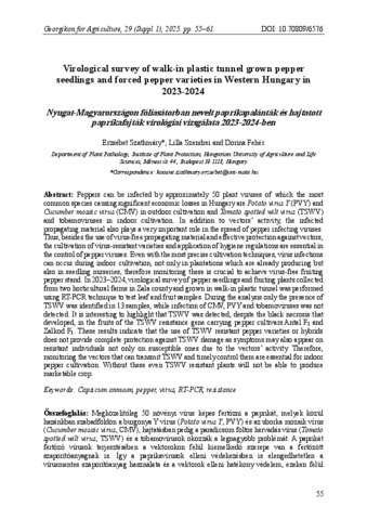 | Kivonat, rövid leírás: | Peppers can be infected by approximately 50 plant viruses of which the most common species causing significant economic losses in Hungary are Potato virus Y (PVY) and Cucumber mosaic virus (CMV) in outdoor cultivation and Tomato spotted wilt virus (TSWV) and tobamoviruses in indoor cultivation. In addition to vectors’ activity, the infected propagating material also plays a very important role in the spread of pepper infecting viruses. Thus, besides the use of virus-free propagating material and effective protection against vectors, the cultivation of virus-resistant varieties and application of hygiene regulations are essential in the control of pepper viruses. Even with the most precise cultivation techniques, virus infections can occur during indoor cultivation, not only in plantations which are already producing but also in seedling nurseries, therefore monitoring these is crucial to achieve virus-free fruiting pepper stand. In 2023–2024, virological survey of pepper seedlings and fruiting plants collected from two horticultural farms in Zala county and grown in walk-in plastic tunnel was performed using RT-PCR technique to test leaf and fruit samples. During the analysis only the presence of TSWV was identified in 13 samples, while infection of CMV, PVY and tobamoviruses was not detected. It is interesting to highlight that TSWV was detected, despite the black necrosis that developed, in the fruits of the TSWV resistance gene carrying pepper cultivars Antal F1 and Zalkod F1.These results indicate that the use of TSWV resistant pepper varieties or hybrids does not provide complete protection against TSWV damage as symptoms may also appear on resistant individuals not only on susceptible ones due to the vectors’ activity. Therefore, monitoring the vectors that can transmit TSWV and timely control them are essential for indoor pepper cultivation. Without these even TSWV resistant plants will not be able to produce marketable crop. |