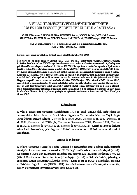ALMÁSI, B és Csákvári, Edina és DEMETER, A és MAJOR, B és MOLNÁR, L és NAGY, E és PISZKER, Z és POLLER, E és SARLÓS, D és URSU, D és VINCZE, T (2014) A világ természetvédelmének története 1976 és 1980 között: védett területek alapítása. TÁJÖKOLÓGIAI LAPOK / JOURNAL OF LANDSCAPE ECOLOGY, 12 (1). pp. 207-219. ISSN 1589-4673