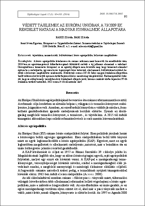 Rákóczi, Attila és Barczi, Attila (2014) Védett tájelemek az Európai Unióban, a 73/2009 EK rendelet hatásai a magyar kunhalmok állapotára. TÁJÖKOLÓGIAI LAPOK / JOURNAL OF LANDSCAPE ECOLOGY, 12 (1). pp. 95-105. ISSN 1589-4673