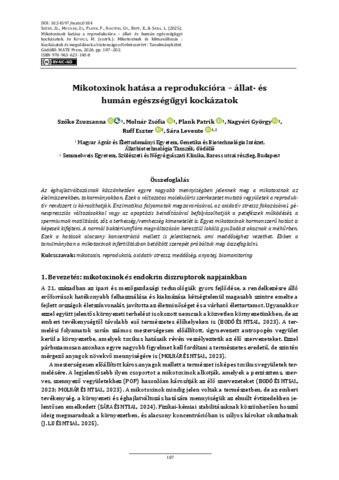 Szőke, Zsuzsanna és Molnár, Zsófia és Plank, Patrik és Nagyéri, György és Ruff, Eszter és Sára, Levente (2026) Mikotoxinok hatása a reprodukcióra – állat- és humán egészségügyi kockázatok. In: Kovács, Melinda (Szerk.) Mikotoxinok és klímaváltozás : Kockázatok és megoldások a biztonságos élelmiszerért : Tanulmánykötet. MATE Press, Gödöllő. pp. 187-202. ISBN 978-963-623-140-8