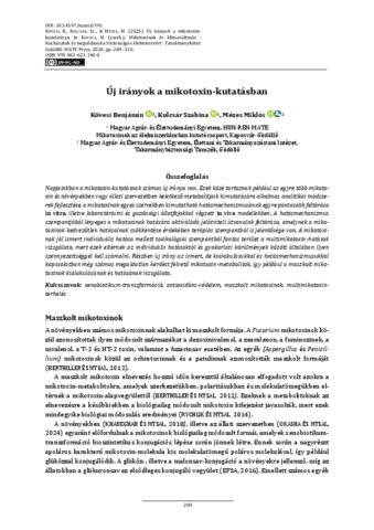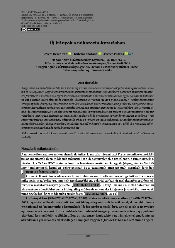 Kövesi, Benjámin és Kulcsár, Szabina és Mézes, Miklós (2026) Új irányok a mikotoxin-kutatásban. In: Kovács, Melinda (Szerk.) Mikotoxinok és klímaváltozás : Kockázatok és megoldások a biztonságos élelmiszerért : Tanulmánykötet. MATE Press, Gödöllő. pp. 289-310. ISBN 978-963-623-140-8