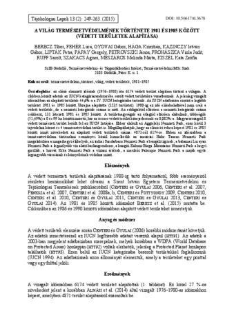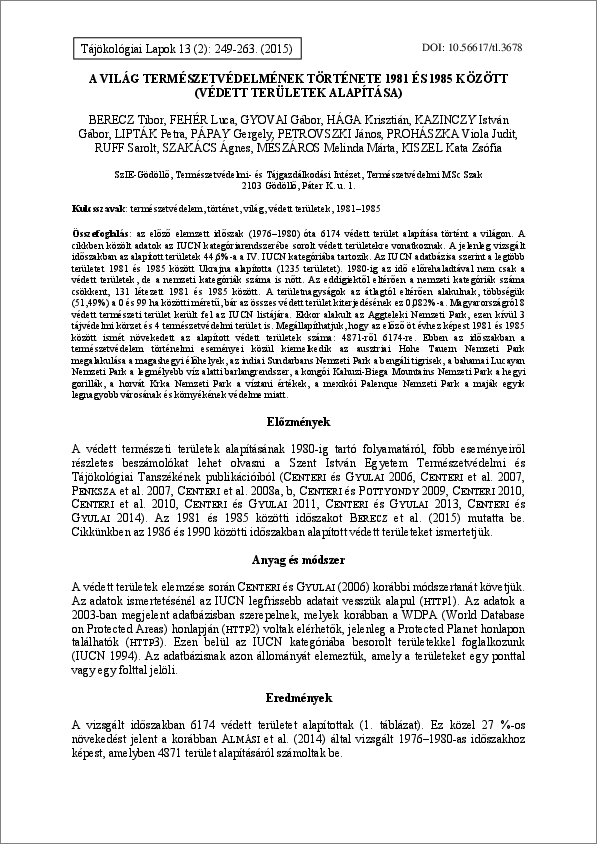 Berecz, Tibor és Fehér, Luca és Gyovai, Gábor és Hága, Krisztián és Kazinczy, István Gábor és Lipták, Petra és Pápay, Gergely és Petrovszki, János és Prohászka, Viola Judit és Ruff, Sarolt és Szakács, Ágnes és Mészáros, Melinda Márta és Kiszel, Kata Zsófia (2015) A világ természetvédelmének története 1981 és 1985 között (védett területek alapítása). TÁJÖKOLÓGIAI LAPOK / JOURNAL OF LANDSCAPE ECOLOGY, 13 (2). pp. 249-263. ISSN 1589-4673