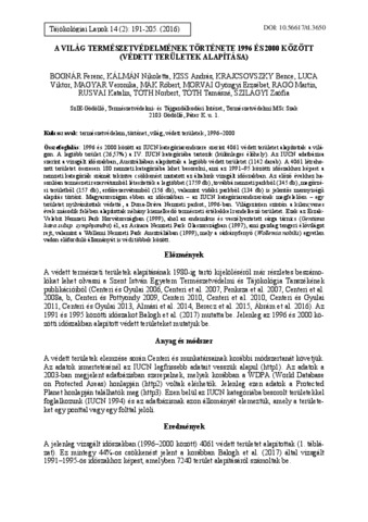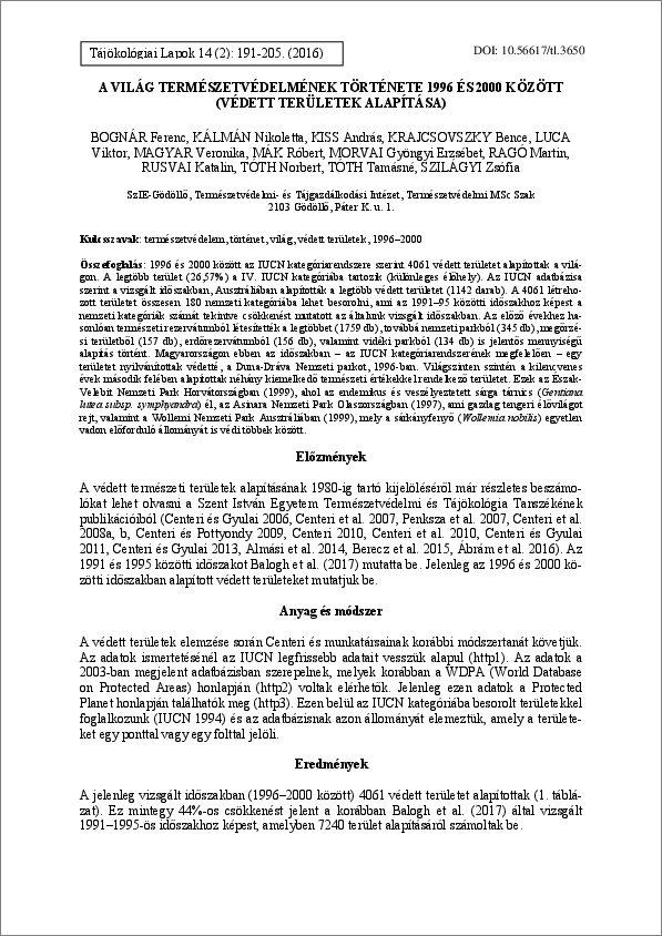 Bognár, Ferenc és Kálmán, Nikoletta és Kiss, András és Krajcsovszky, Bence és Luca, Viktor és Magyar, Veronika és Mák, Róbert és Morvai, Gyöngyi Erzsébet és Ragó, Martin és Rusvai, Katalin és Tóth, Norbert és Tóth, Tamásné és Szilágyi, Zsófia (2016) A világ természetvédelmének története 1996 és 2000 között (védett területek alapítása). TÁJÖKOLÓGIAI LAPOK / JOURNAL OF LANDSCAPE ECOLOGY, 14 (2). pp. 191-205. ISSN 1589-4673