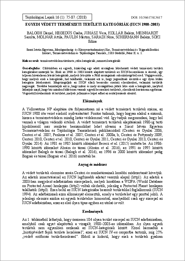 Balogh, Dániel és Hegedüs, Csaba és Lente, Vera és Kollár, Balázs és Meinhardt, Sarolta és Molnár, Attila és Paulin, Márton és Sáradi, Nóra és Schermann, Balázs és Sóki, Edina (2018) Egyedi védett természeti területi kategóriák (IUCN 1900-2003). TÁJÖKOLÓGIAI LAPOK / JOURNAL OF LANDSCAPE ECOLOGY, 16 (1). pp. 75-87. ISSN 1589-4673