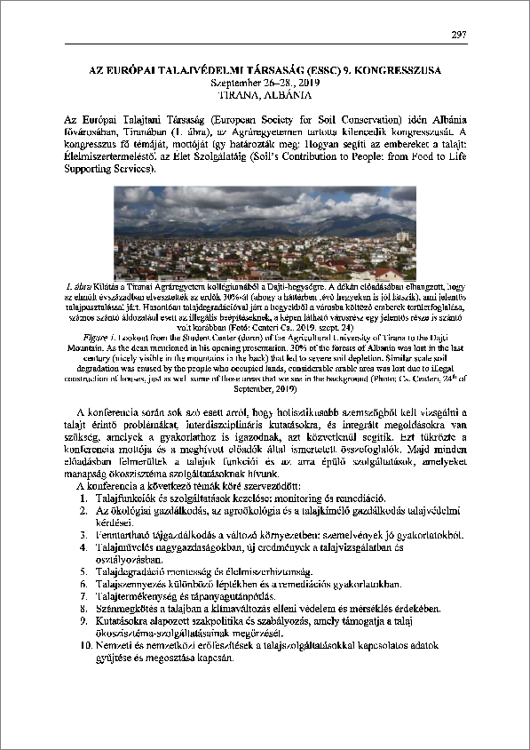 Szilágyi, Alfréd János (2019) Az Európai Talajvédelmi Társaság (ESSC) 9. kongresszusa Szeptember 26-28., 2019, Tirana, Albánia. TÁJÖKOLÓGIAI LAPOK / JOURNAL OF LANDSCAPE ECOLOGY, 17 (2). pp. 297-300. ISSN 1589-4673