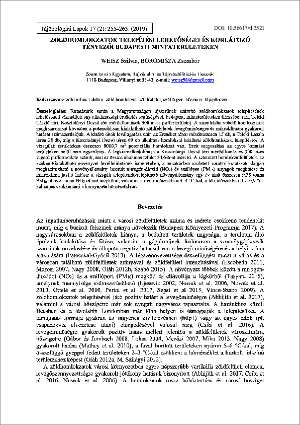 Weisz, Szilvia és Boromisza, Zsombor (2019) Zöldhomlokzatok telepítési lehetőségei és korlátozó tényezői budapesti mintaterületeken. TÁJÖKOLÓGIAI LAPOK / JOURNAL OF LANDSCAPE ECOLOGY, 17 (2). pp. 255-263. ISSN 1589-4673