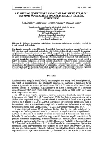 Ábrám, Örs és Biró, Csaba és Morvai, Edina és Tormáné Kovács, Eszter (2020) A Kiskunsági Nemzeti Park Kolon-tavi törzsterülete által nyújtott ökoszisztéma-szolgáltatások értékelése, térképezése. TÁJÖKOLÓGIAI LAPOK / JOURNAL OF LANDSCAPE ECOLOGY, 18 (1). pp. 1-13. ISSN 1589-4673