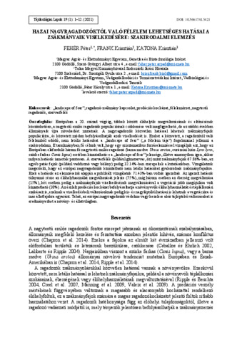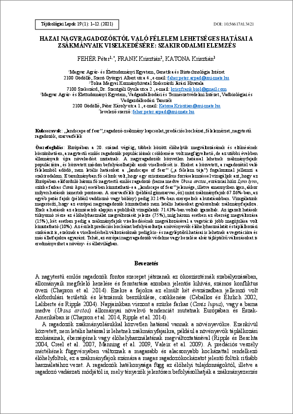 Fehér, Péter Árpád és Frank, Krisztián és Katona, Krisztián (2021) Hazai nagyragadozóktól való félelem lehetséges hatásai a zsákmányaik viselkedésére: Szakirodalmi elemzés. TÁJÖKOLÓGIAI LAPOK / JOURNAL OF LANDSCAPE ECOLOGY, 19 (1). pp. 1-12. ISSN 1589-4673