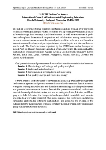 Pitta-Osses, Natalia (2022) 13th ICEEE Online Conference International Council of Environmental Engineering Education Óbuda University, Budapest, November 17–18th 2022. TÁJÖKOLÓGIAI LAPOK / JOURNAL OF LANDSCAPE ECOLOGY, 20 (2). pp. 131-136. ISSN 1589-4673