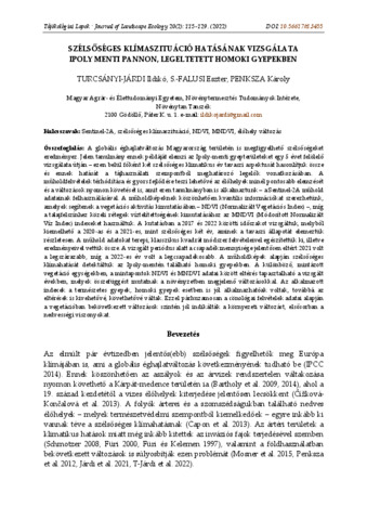 | Kivonat, rövid leírás: | A globális éghajlatváltozás Magyarország területén is megfigyelhető szélsőségeket eredményez. Jelen tanulmány ennek példáját elemzi az Ipoly-menti gyepterületeket egy 5 évet felölelő vizsgálata útján – ezen belül főként két szélsőséges klimatikus év tavaszi aspektusát hasonlítjuk össze és ennek hatását a tájhasználati szempontból meghatározó legelők vonatkozásában. A műholdfelvételek térhódítása és gyors fejlődése teszi lehetővé az élőhelyek minél pontosabb elemzését és a változások nyomon követését is, amit ezen tanulmányban is alkalmaztunk – a Sentinel-2A műhold adatainak felhasználásával. A műholdképeknek köszönhetően kvantilis információkat szerezhetünk, amelyek segítenek a vegetációs aktivitás kimutatásában – NDVI (Normalizált Vegetációs Index) –, míg a talajfelszínhez közeli rétegek víztelítettségének kimutatásához az MNDVI (Módosított Normalizált Víz Index) indexeket használtuk. A kutatásban a 2017 és 2022 közötti időszakot vizsgáltuk, melyből kiemelhető a 2020-as és a 2021-es, mint szélsőséges két év, aminek a tavaszi állapotát elemeztük részletesen. A műhold adatokat terepi, klasszikus kvadrát módszer felvételeivel egészítettük ki, illetve eredményeivel vettük össze. A vizsgált periódus alatt a csapadék mennyisége jelentősen eltért: 2021 volt a legszárazabb, míg a 2022-es év volt a legcsapadékosabb. A műholdképek alapján szélsőséges klímahatását detektáltuk az Ipoly-mentén található homoki gyepekben. A különböző, mintázott vegetáció egységekben, a mintapontok NDVI és MNDVI adatai között eltérés tapasztalható a vizsgált években, melyek összefüggést mutatnak a növényzetben megjelenő változásokkal. Az alkalmazott indexek a természetes gyepek, homoki gyepek esetben is jól alkalmazhatóak voltak, továbbá az eltérések is kivehetővé, követhetővé váltak. Ezzel párhuzamosan a cönológai felvételek adatai alapján a vegetációban bekövetkezett változások szintén jól indikálták a környezeti változást, elsősorban a nedvességi viszonyokat. |