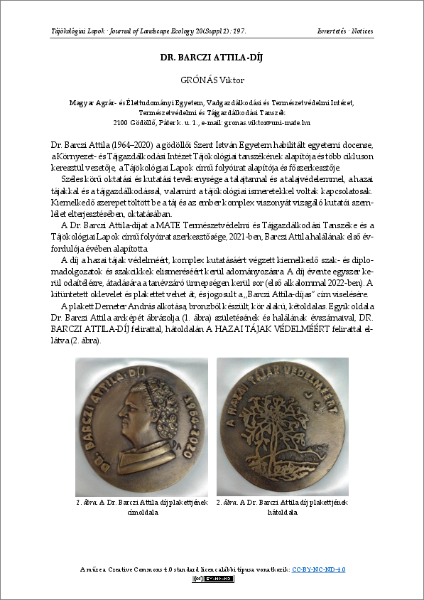 Grónás, Viktor (2022) Dr. Barczi Attila-díj. TÁJÖKOLÓGIAI LAPOK / JOURNAL OF LANDSCAPE ECOLOGY, 20 (Suppl.). p. 197. ISSN 1589-4673