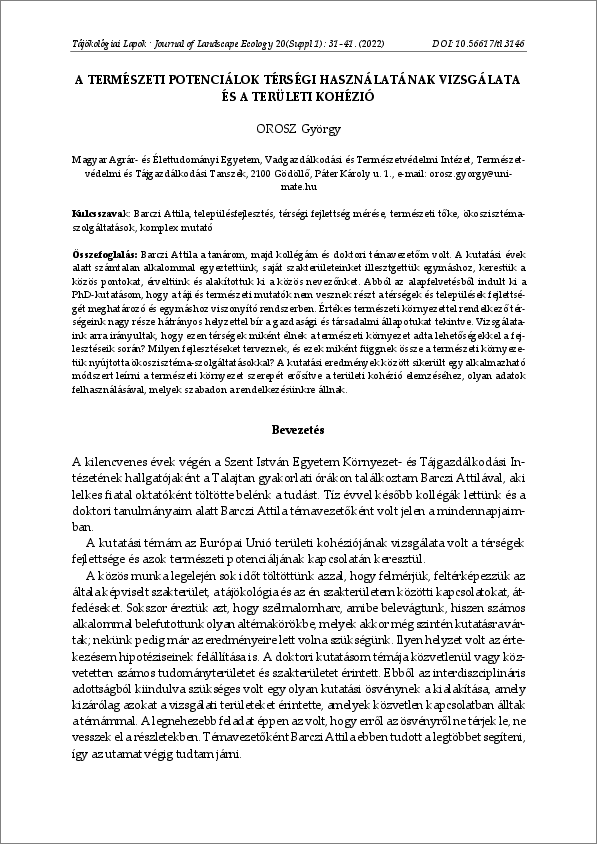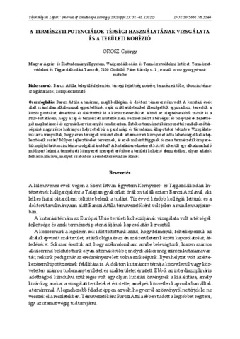 Orosz, György (2022) A természeti potenciálok térségi használatának vizsgálata és a területi kohézió. TÁJÖKOLÓGIAI LAPOK / JOURNAL OF LANDSCAPE ECOLOGY, 20 (Suppl.). pp. 31-41. ISSN 1589-4673