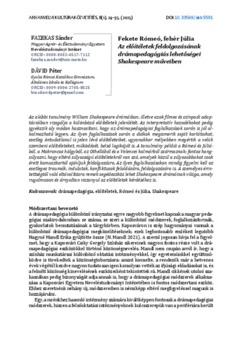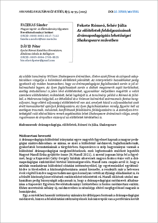 Fazekas, Sándor és Dávid, Péter (2025) Fekete Rómeó, fehér Júlia : Az előítéletek feldolgozásának drámapedagógiai lehetőségei Shakespeare műveiben. ANYANYELVI KULTÚRAKÖZVETÍTÉS, 8 (1). pp. 24-35. ISSN 2063-2991