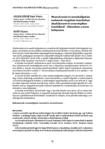Gelencsérné Bakó, Márta és Horti, Eszter (2025) Meseolvasási és mesehallgatási szokások vizsgálata tanulásban akadályozott és neurotipikus tanulóknál – fókuszban a mese befejezése. ANYANYELVI KULTÚRAKÖZVETÍTÉS, 8 (2). pp. 43-53. ISSN 2063-2991