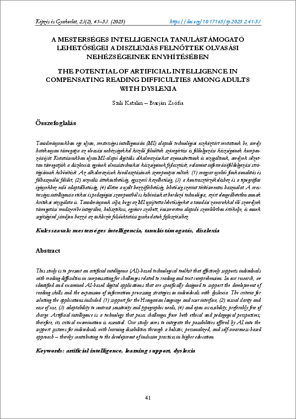Szili, Katalin és Burján, Zsófia (2025) A mesterséges intelligencia tanulástámogató lehetőségei a diszlexiás felnőttek olvasási nehézségeinek enyhítésében. KÉPZÉS ÉS GYAKORLAT: TRAINING AND PRACTICE, 23 (2). pp. 41-53. ISSN 1589-519X