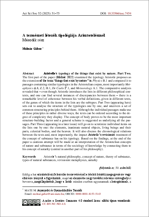 | Kivonat, rövid leírás: | The first part of the paper (Molnár 2022) examined the typology Aristotle proposes as the extension of the term “things that exist by nature” in Physics B.1 and compared it to passages containing similar typologies in the Aristotelian corpus, most importantly Metaphysics D.8, Z.2, H.1, De Caelo G.1, and Meteorology A.1. The comparative analysis revealed that – even though Aristotle introduces the lists in different philosophical contexts, and one can find several instances of discrepancies between them – there is a remarkable level of coherence between his verbal definitions, given in different texts, of the genus of which the items in the lists are the subtypes. Part Two (appearing here) sets out to analyse the structure of the typologies one by one, and uncovers a set of common structuring principles behind them. Although the individual passages make use of these principles in rather diverse ways, the texts can be ordered according to the degree of complexity they display. The concept of body proves to be the most important structure-building factor and a general scheme is suggested as underlying all the passages. Part Three (appearing in a later issue) will go on to scrutinize individual items on the lists one by one: the elements, inanimate natural objects, living beings and their parts, celestial bodies, and the heaven. It will also discuss the chronological relations between the texts and, most importantly, the impact Aristotle’s revisionist treatment of the concept of substance has on his typology. Based on the findings, at the end of the paper a cautious attempt will be made at an interpretation of the Aristotelian concepts of nature and substance in terms of the sociology of knowledge by connecting them to his concept of autarky (central in another part of his philosophy). |