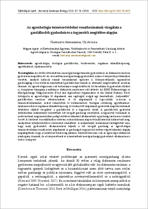 Harkányi, Annamária és Ujj, Apolka (2023) Az agroökológia természetvédelmi vonatkozásainak vizsgálata a gazdálkodók gyakorlata és a fogyasztók megítélése alapján. TÁJÖKOLÓGIAI LAPOK / JOURNAL OF LANDSCAPE ECOLOGY, 21 (2). pp. 47-74. ISSN 1589-4673